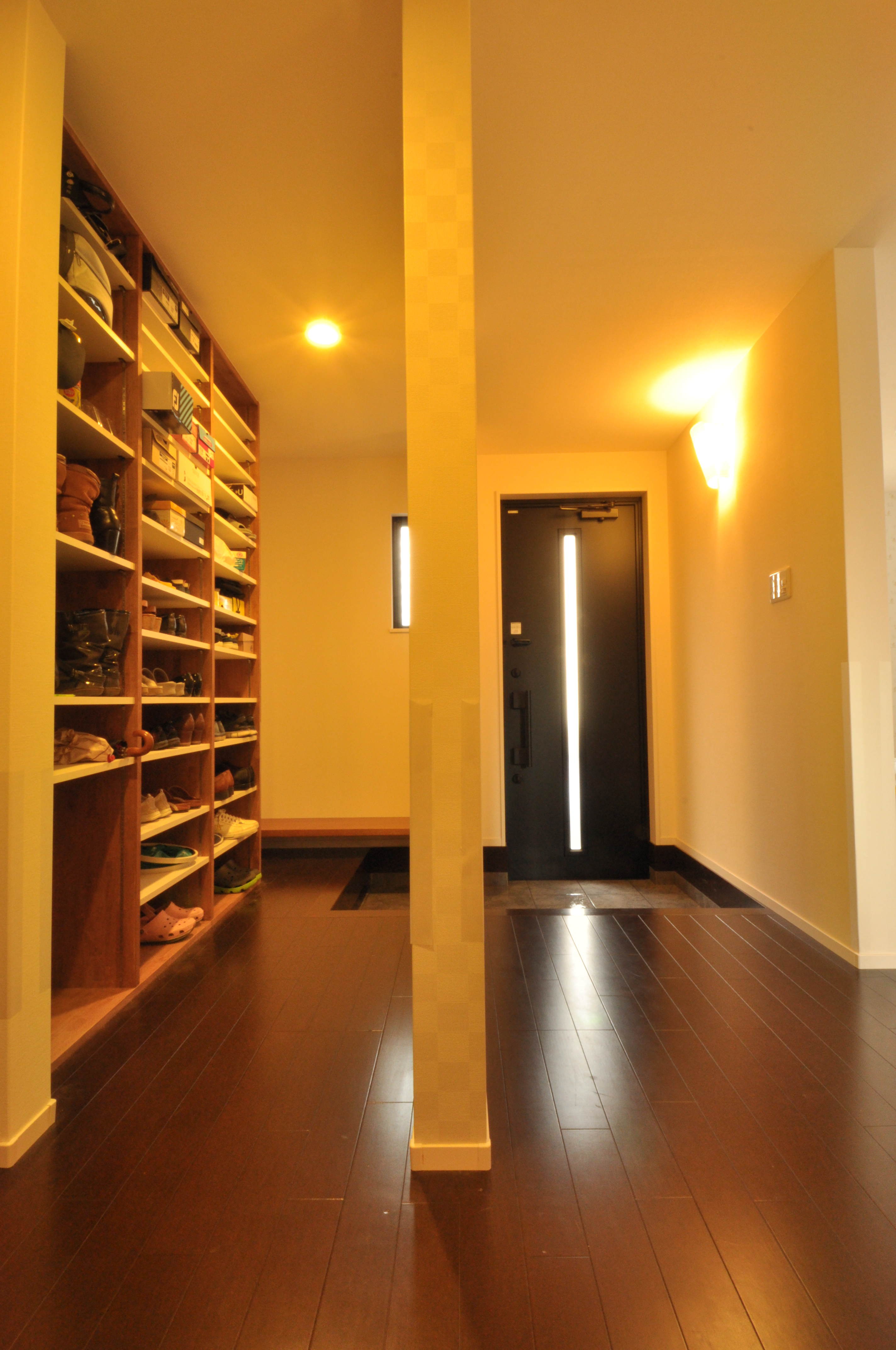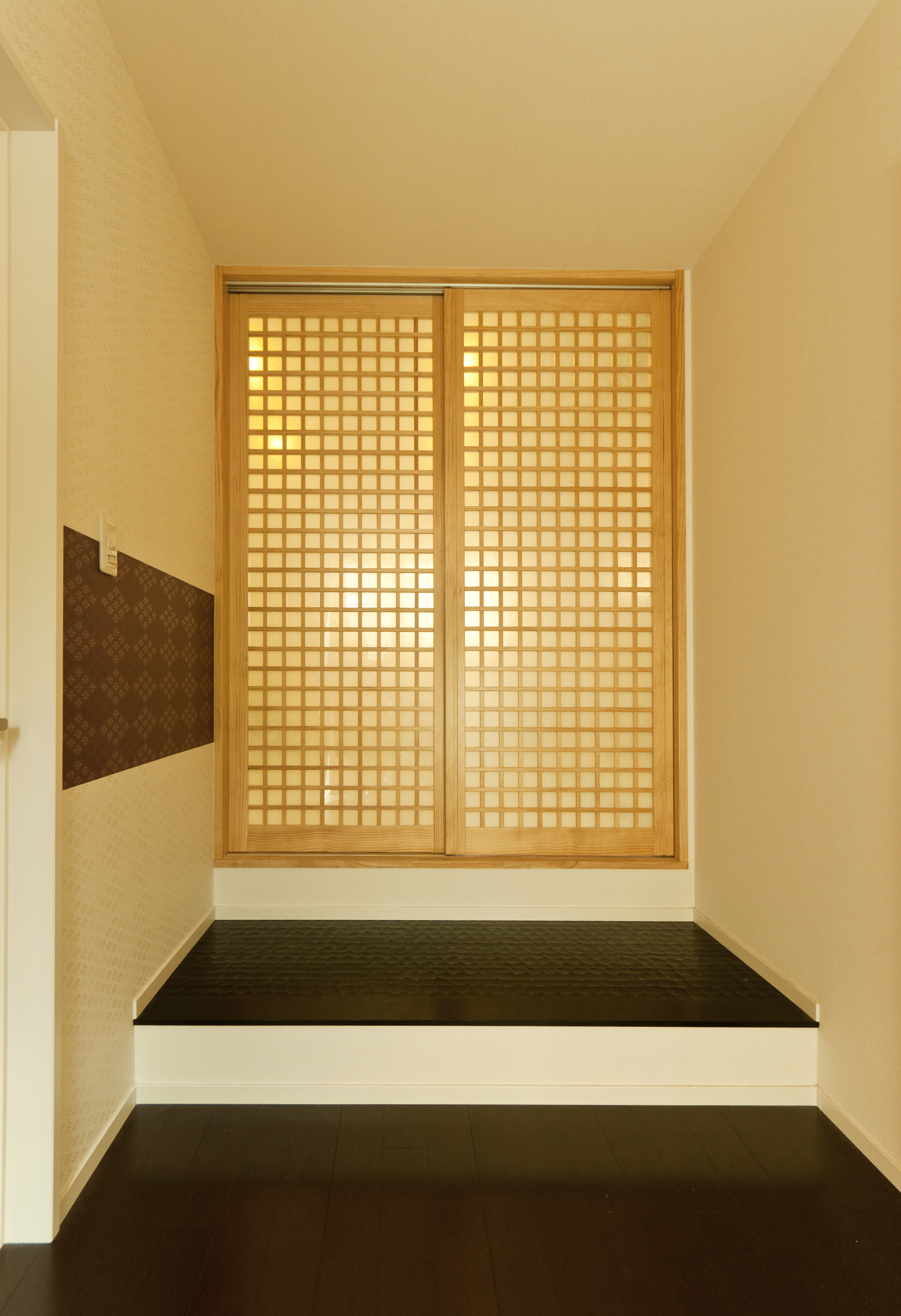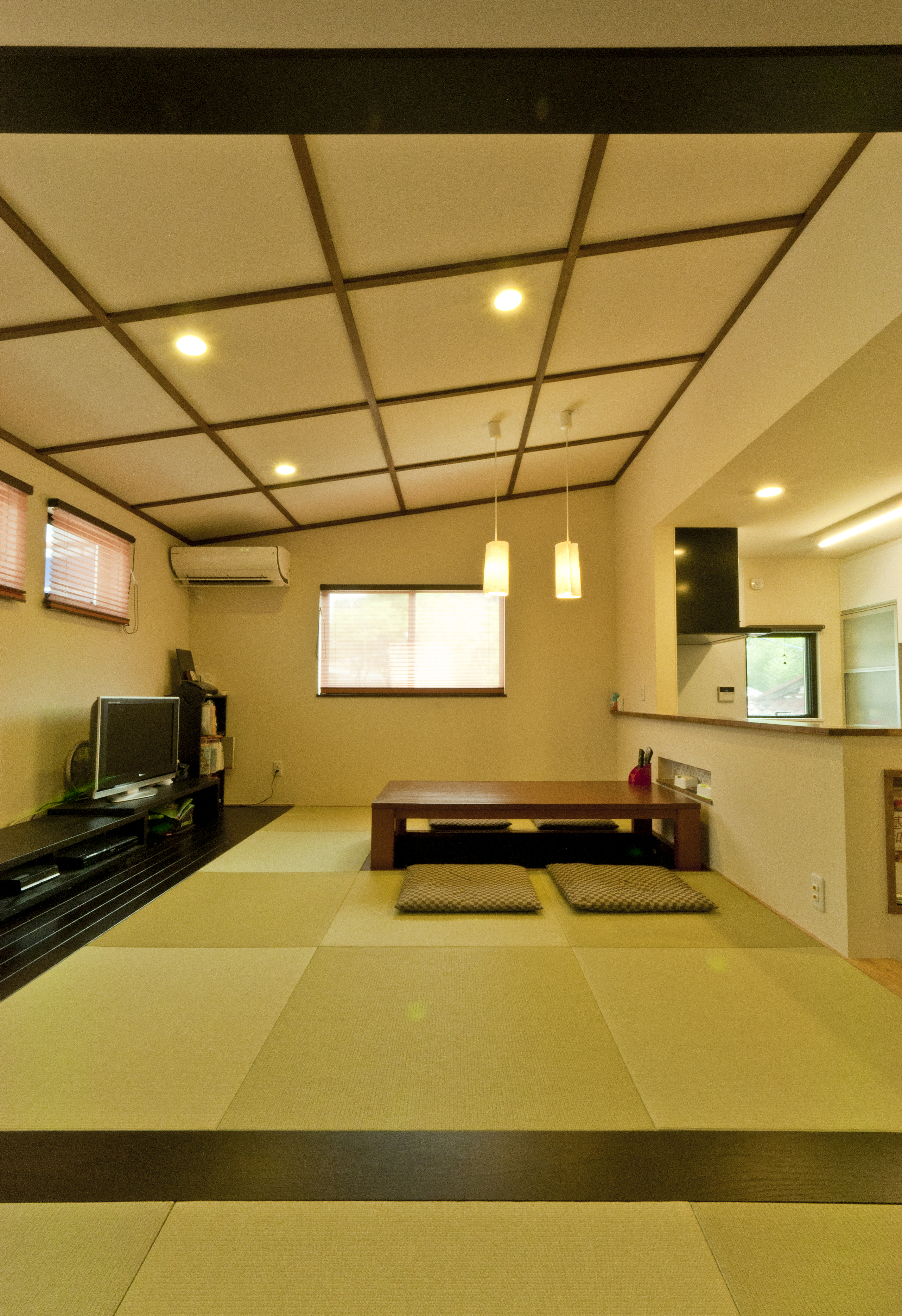 屋根勾配を活かした空間構成に全面小上がりのタタミリビング。掘りごたつ形式のダイニングに腰を据えればキッチンに立つ家族とのアイラインがぐっと近くなります。家具配置に配慮した板の間が空間をぐっと引き締めます。